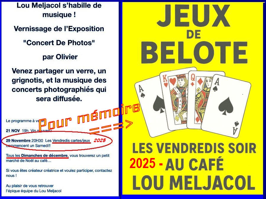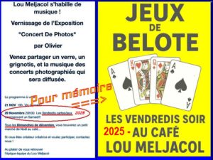 Nouveautés, Page Actualités 01-12-2025 Jeux de belote les vendredis soirs à 20h30 au café Lou Meljacol 1 décembre 2025 wpsmn_admin
