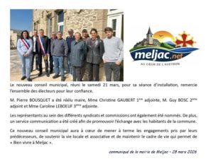 Nouveautés, Page Actualités 28-03-2026. Conseil municipal de Meljac du 21 mars 29 mars 2026 wpsmn_admin Communiqué de la mairie de Meljac du 28.03.2026 (conseil munic.du 21.3)